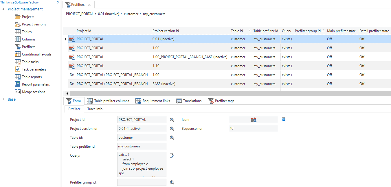 The Project management menu group gives Overview of several subjects, like tables, columns and prefilters, outside the context of projects and versions. This can be helpful to, for example, compare different versions of your application.