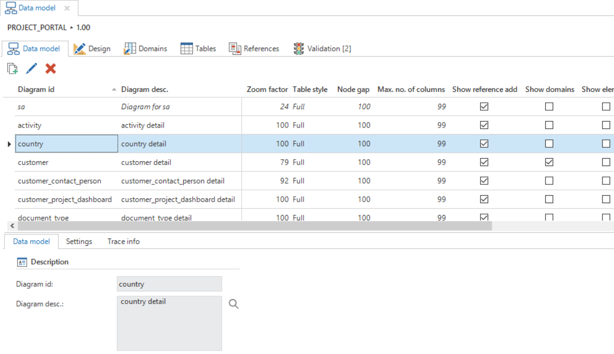 Since a data model can consist of many tables with columns, an overview can quickly become very unclear. To avoid this, it is possible to produce several diagrams each describing a subset of the complete model. A task is available to produce one's own diagram. This diagram is always at the top of the list of diagrams and can only be used by the user who is logged in. This prevents two developers getting in each other's way when designing.