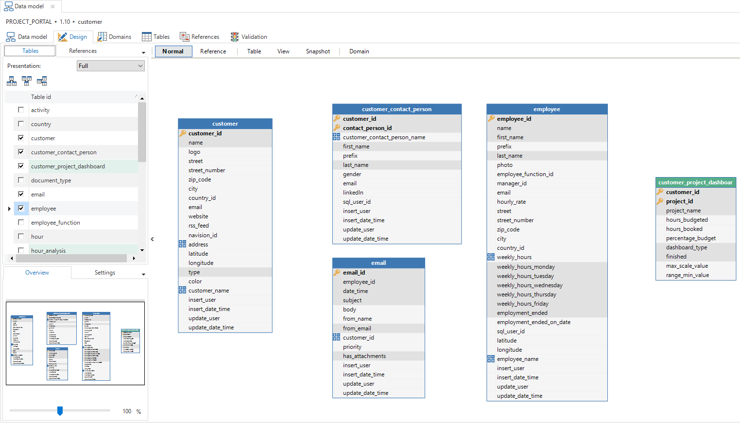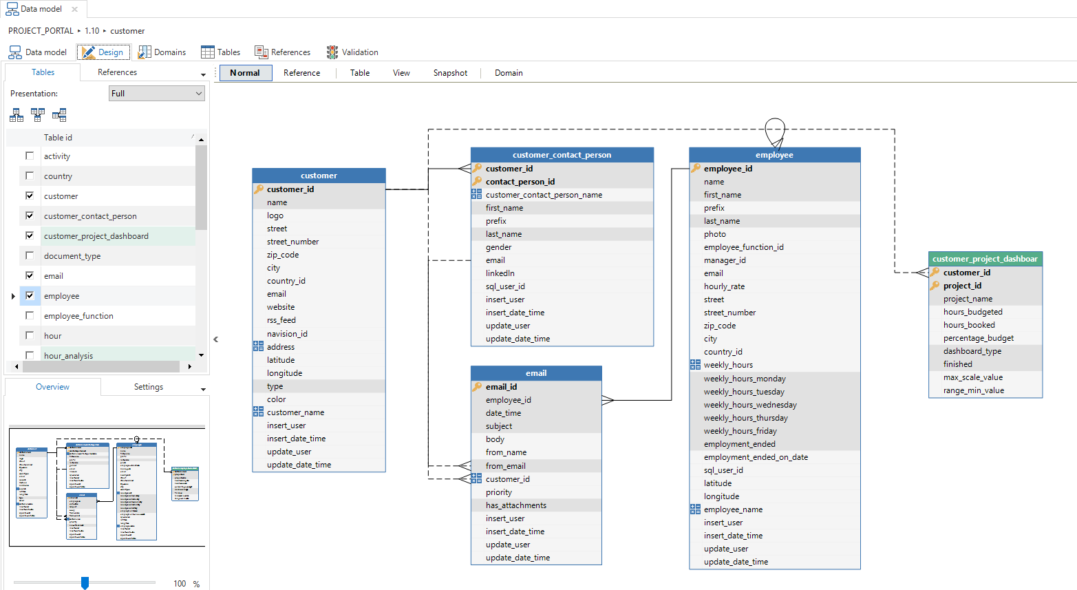This screen has a number of functions that help when designing the data model. A list is visible in the left hand column with all the tables and views. Besides this, there is a similar list with all the references. These can be checked and unchecked to use them within the diagram.