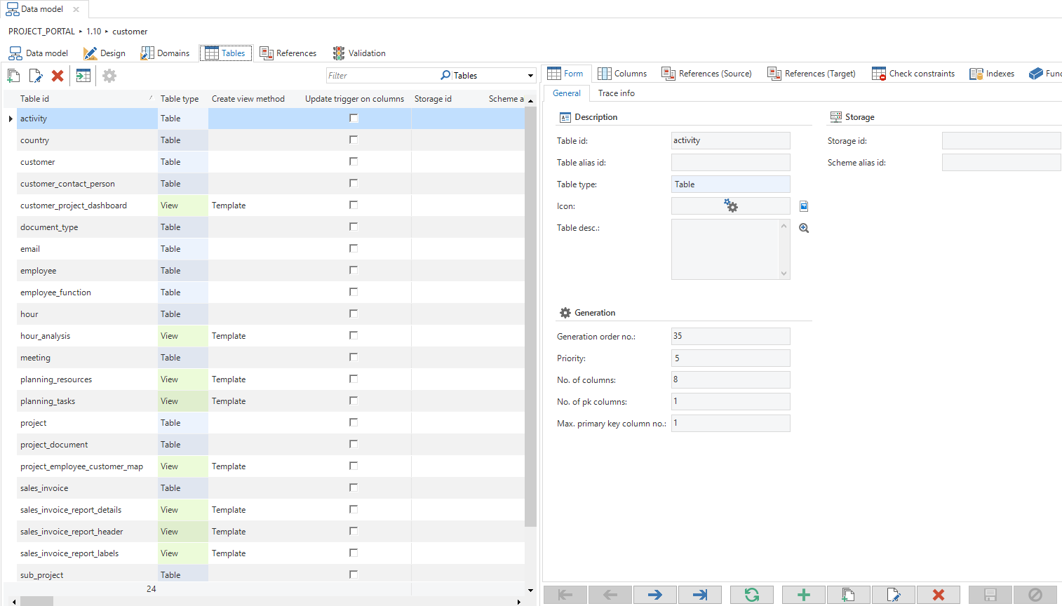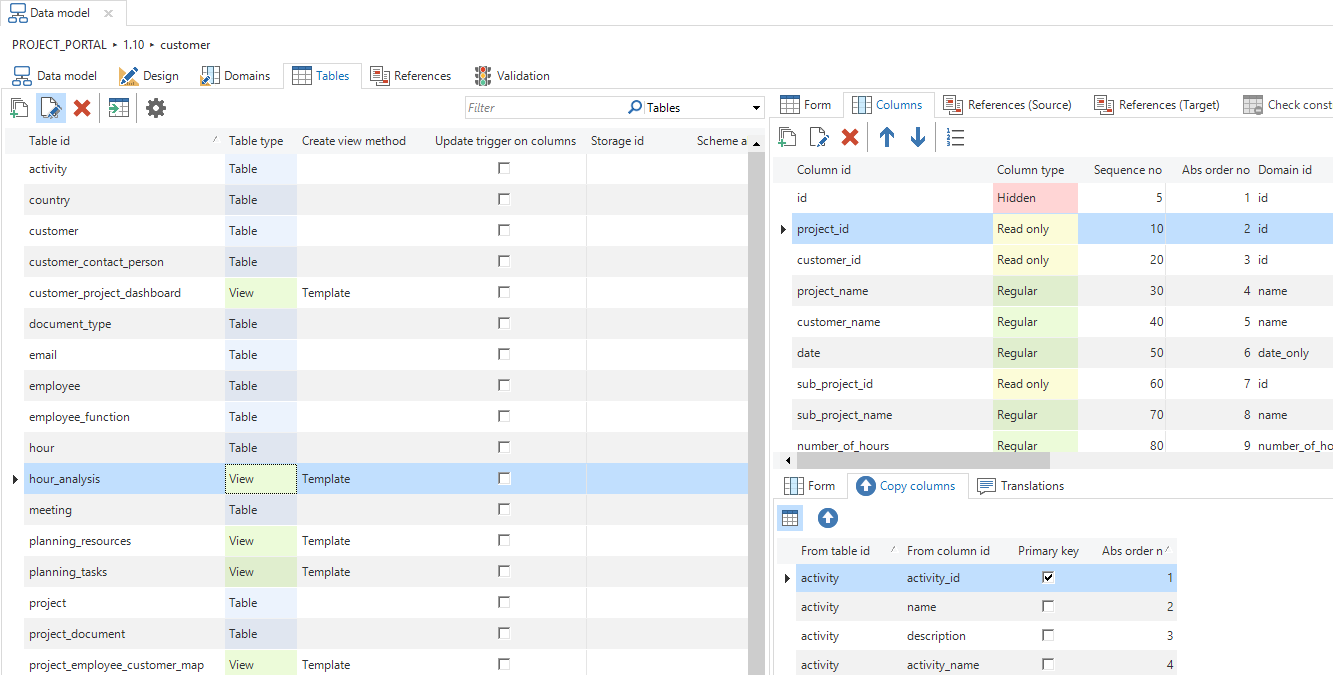 The data model screen allows you to visually design the data model of your application. A data model consists of tables, containing columns, and references, to create relations between tables.