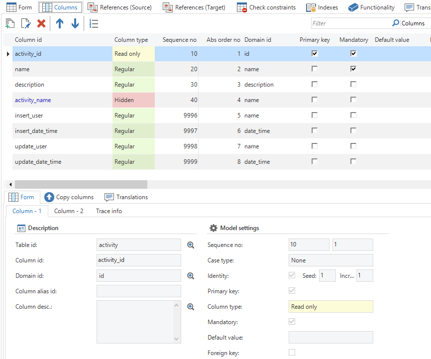 The columns are defined within a table under the columns tab. A column has the following properties: