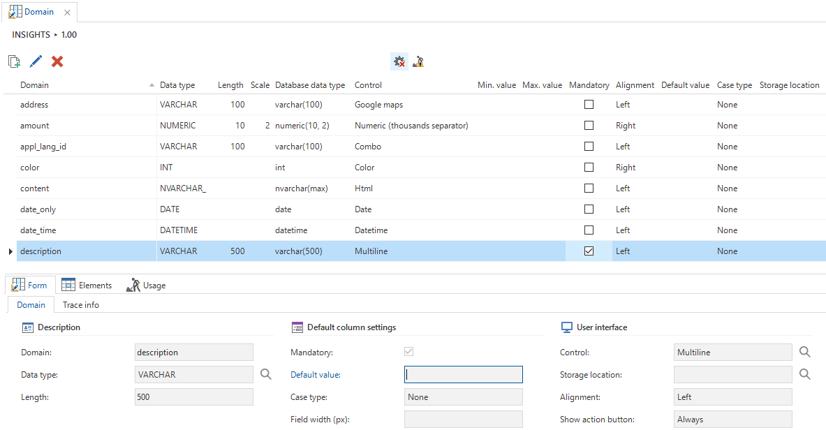 Several default settings for columns can also be provided. An example of this is the Mandatory field. If this is checked, new columns created with this domain are also mandatory by default. You can still uncheck this option on a per column basis.