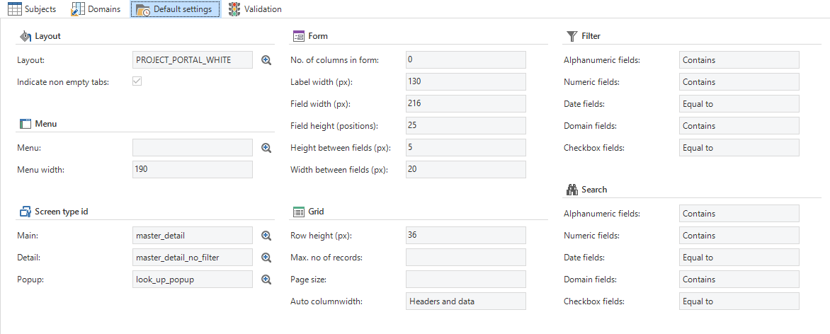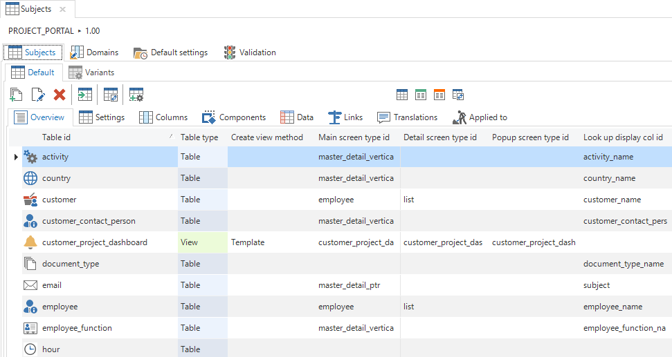 In the Subjects screen, every table or view can be fully set up for the user interface. These settings are specified on various tabs that are described in the following paragraphs.
