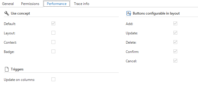 Using the option in the Performance tab, it can be indicated in detail which mechanisms and concepts are used for a subject. In this way, it can be ensured that there are no unnecessary calls to the logic layer, and the user interfaces are as efficient as possible.