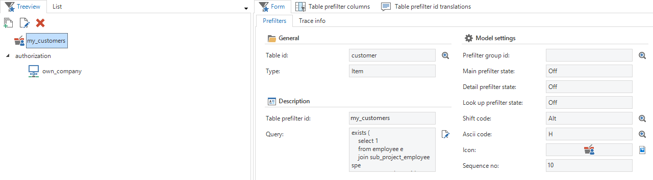 It is possible to specify for the following components, by means of a combo, what the default of the prefilter should be (hidden, off, on, on & locked, on & hidden). The last two are actually a way to add authorization.