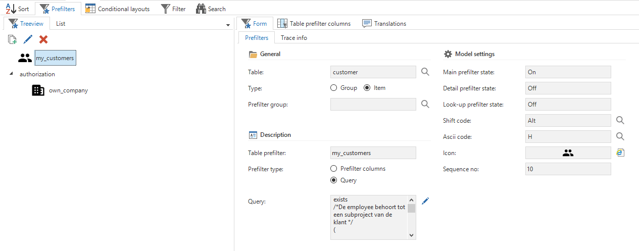 When conditions have to be assigned to columns, this is done on the prefilter columns tab. The developer indicates on this tab which column ID is added to the prefilter and which condition and value the prefilter should have. This concerns the database value and not the translation.