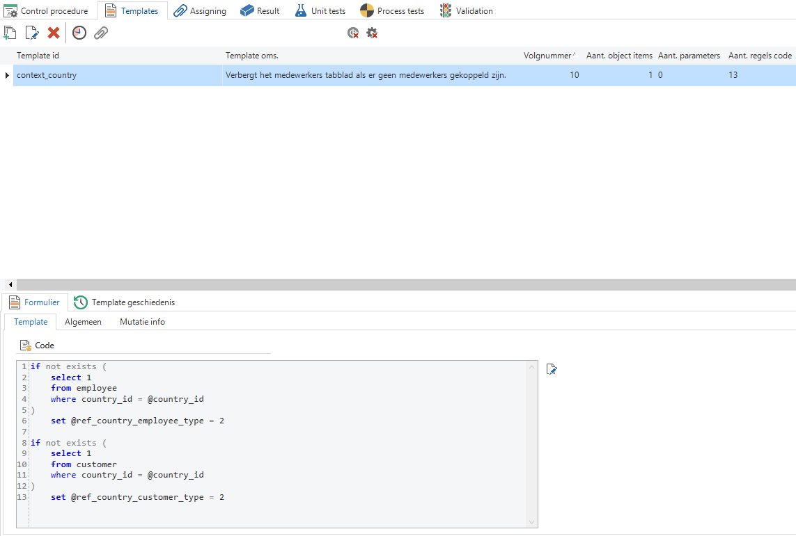 Thinkwise recommends entering the name of the developer when creating a control procedure so that if there are any questions about the development, the right developer will always be easily accessible. The developer tests their own template and sets it to complete when it is complete. Since a developer only works on one template at a time, each developer only has one template at the most under development. The exception is a group of templates that form a logical unit. The review checkmark is subsequently checked by the project manager. They determine who tests which templates.