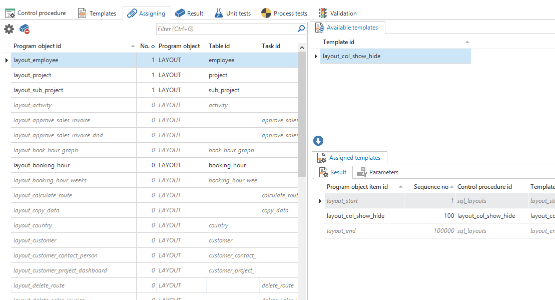 Assigning - For statically assigned business logic, the template can be assigned to the various program objects. Parameter values can be specified for every assignment.