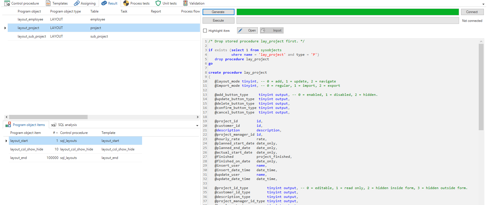 Result - This is where the program objects, which make use of the template, are (re)generated and can be applied. You can also perform a static code analysis of the generated program objects.