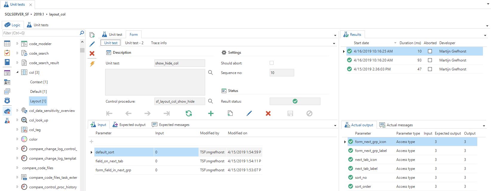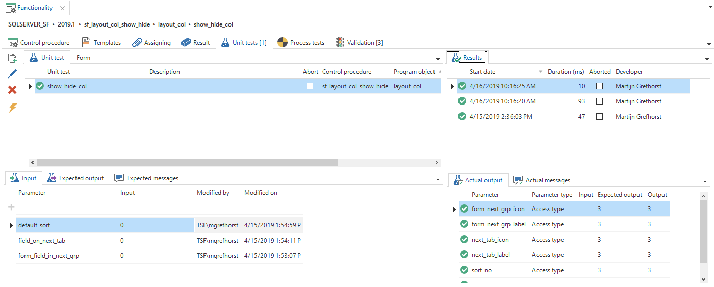 A distinction is made between input and output parameters. The output parameters will be checked after the unit test has been executed. In addition, the expected messages can be specified. These will also be checked after performing a unit test.