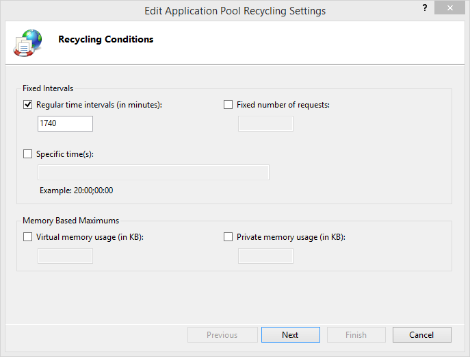 By default, IIS recycles an application every 1740 minutes (29 hours) in order to prevent potential problems in the application or server. This means that logged-in users will lose their session and have to log in again. Thinkwise advises that recycling be done at a fixed time, for example, daily or weekly at 03:00.