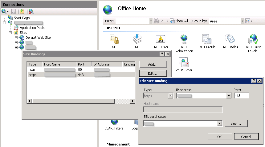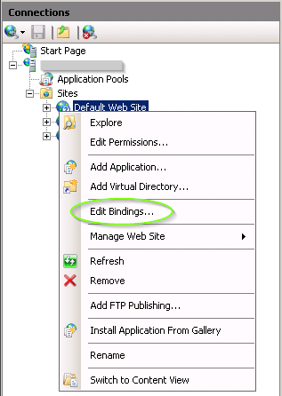 Connecting the certificate to the URL is done in IIS by right-clicking on the website in which the web application has been placed and choosing Edit Bindings… .