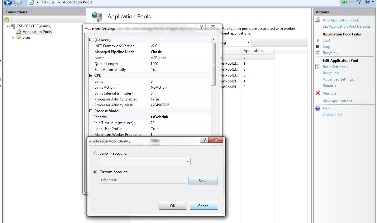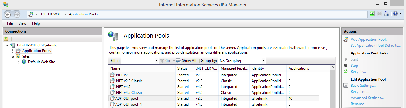 IIS uses Application Pools to run applications and to make configurations for these applications. By using different Application pools, it is ensured that web applications can function separately from each other. It also ensures that they are not in the way of each other if an error arises with one of the web applications due to a crash or memory problems. Thinkwise therefore advises that a new pool is made in IIS for each Thinkwise Web GUI.