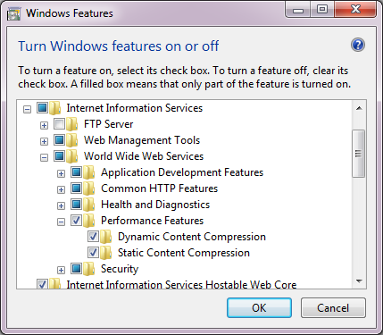 In order to limit the data traffic and, by extension, improve the performance, we strongly advise that Dynamic Content Compression is turned on in IIS. Less data traffic means that the end user will be able to see the result of the executed action more quickly. This functionality must first be installed before it can be used. This can be done by enabling it in Windows Features.