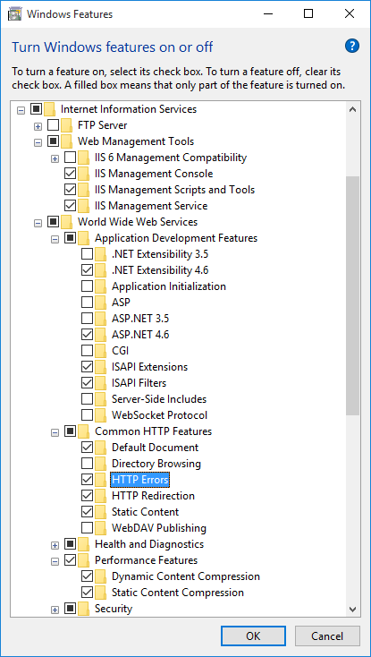 The standard installation of IIS does not contain all components that are needed to run the Thinkwise Web GUI. The right components can be enabled via Windows' Windows Feature screen, which is accessible via the Windows control panel. In the image below, the necessary components are for different Windows versions.