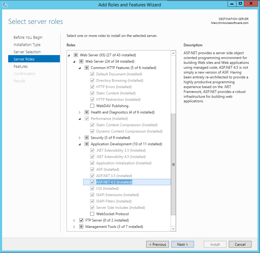 The Thinkwise Web GUI runs on IIS version 8 or up (10 is advised) and requires the .NET Framework 4.7 as well as the ASP.NET Framework.