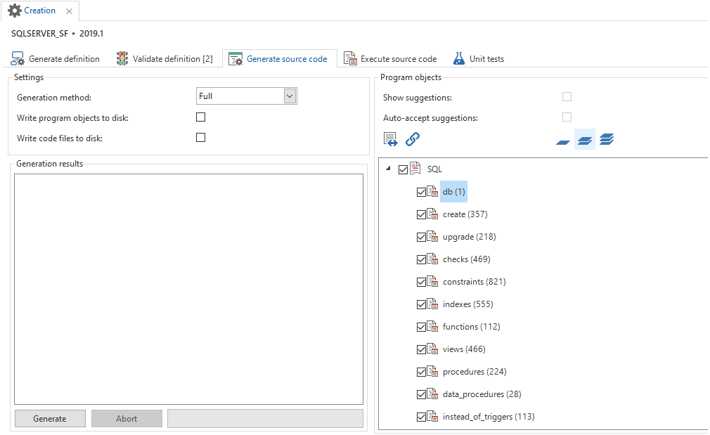 With this option, only modified objects are reapplied to the database. However, this option can only be used when the end product database is the same as the previous version of the model. This is often the case when upgrading a production version. The smart way of generating significantly speeds up the upgrading process, for example because unmodified indexes are not rebuilt and it reduces the risk of an upgrade.