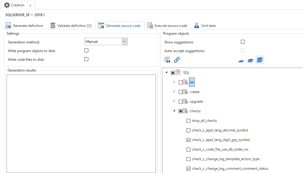 A manual generation offers the opportunity to checkmark program objects that have to be executed. Only the checked program objects are used in the compilation of the code files.