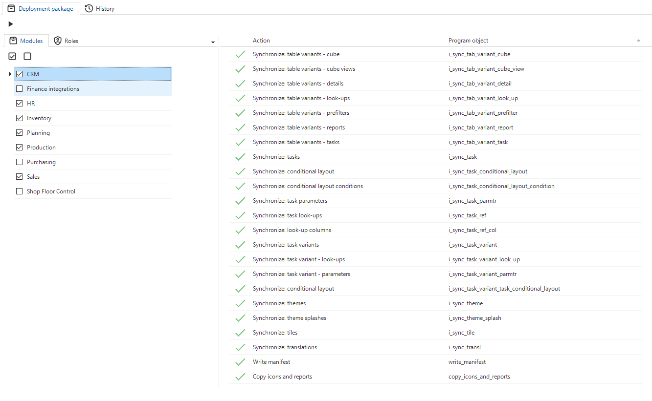 The Roles tab shows all roles and any modules they are included in. A checkmark in front of the role indicates if it will be included in the deployment package.