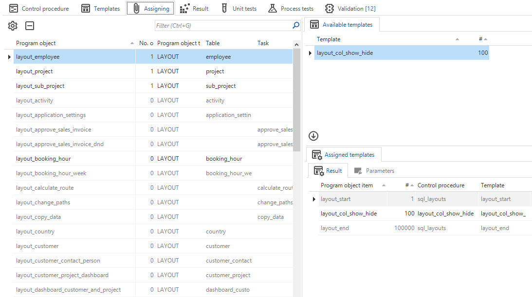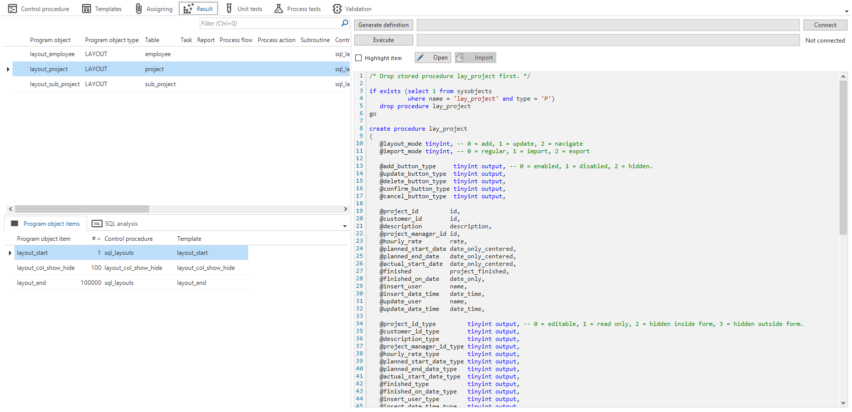 Result - This is where the program objects, which make use of the template, are (re)generated and can be applied. You can also perform a static code analysis of the generated program objects.