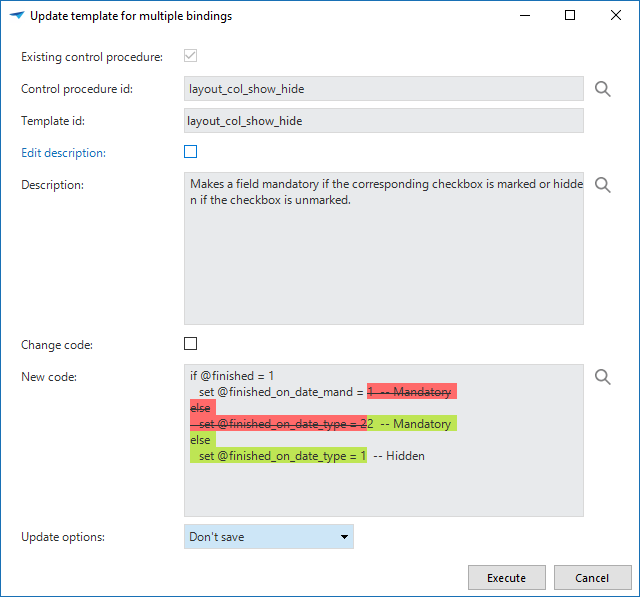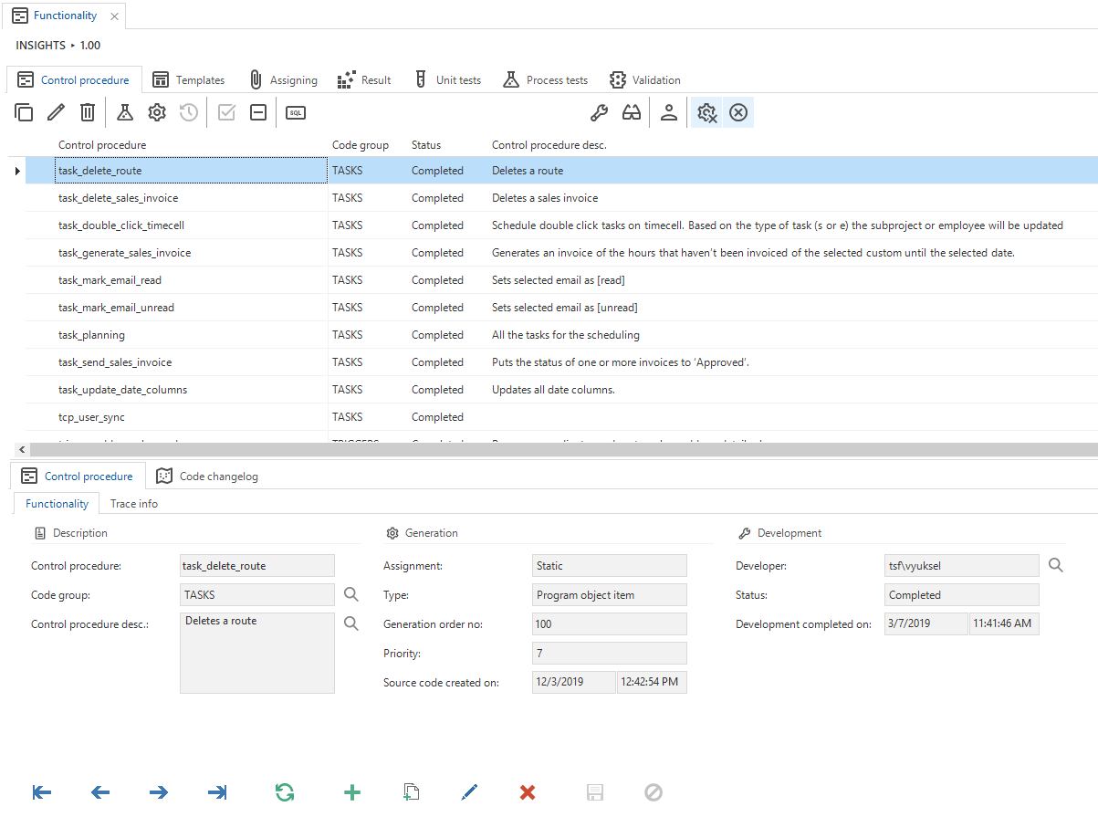It is also recorded when a template is modified and when the source code was last generated. After the development is finished, the control procedure should receive the status Completed. This is done by calling the Complete control procedure task. It must be indicated in the pop-up what must be included in the change log.