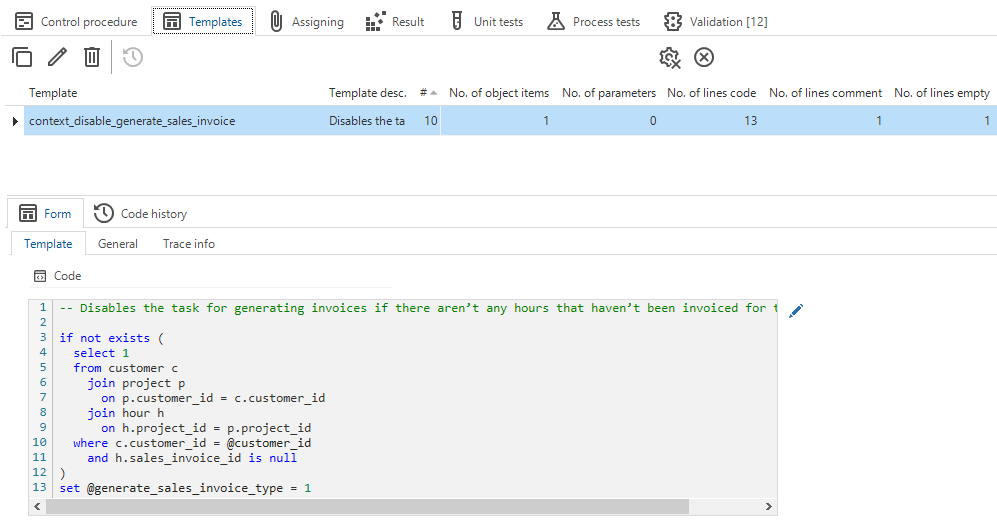Functionality is written in the form of code templates, based on the functional description which has been drawn up when modeling the application logic. A control procedure always contains one or more templates.