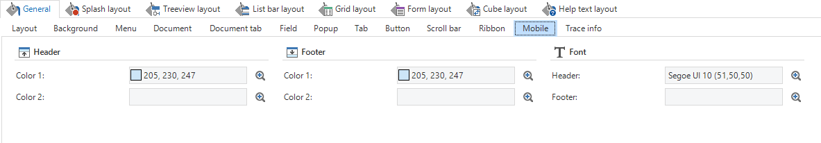 In the following sub tabs, you can specify the group colors, row colors and the focus cell colors. These can be set for the active row, the selected row and for a mouse over.