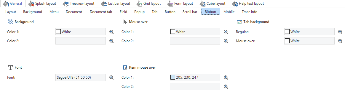 When the colors are set for the ribbon, you can choose to set a general background color. In addition, you can set a mouseover color for a segment or for just a button