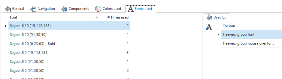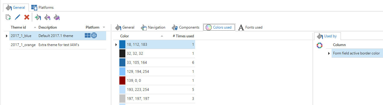 When creating a theme, it is recommended to use a limited set of colors. In the Colors used tab page, it is possible to see which colors are used and where they are used.