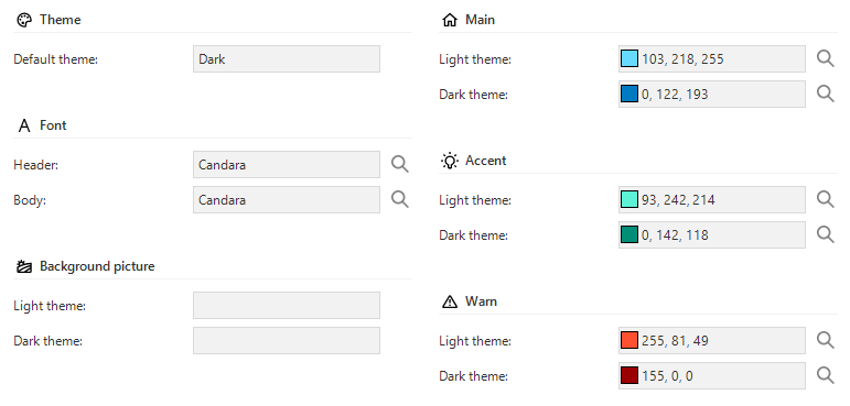 For universal themes, the default mode can be set to either Dark or Light. Because a user can switch between the dark and light mode, settings are available for both the dark and light mode of the theme.